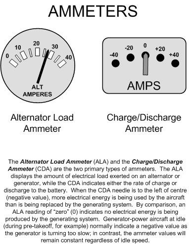 Two types of electrical monitoring instruments are the ammeter, which measures the rate of flow associated with the current being produced, and the voltmeter, which indicates the voltage in the system. An ammeter should always indicate a reading that is greater than zero.