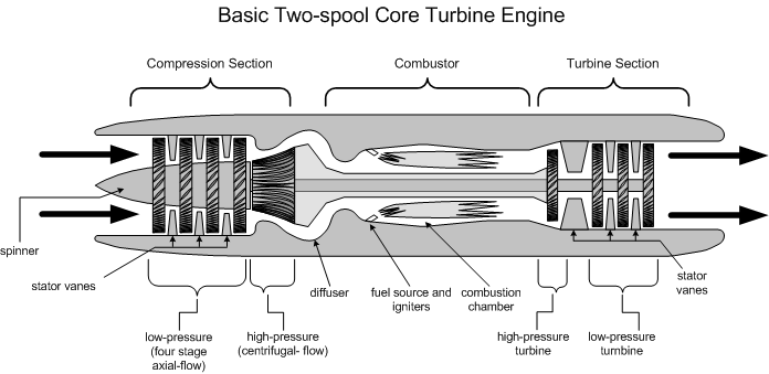 These basic components of turbine engines discussed above are associated with gas generator engines, core turbine engines, or turbojet engines—all basically the same type of engine. In contrast, there are major structural changes in what are referred to as turbofan and turboprop.
