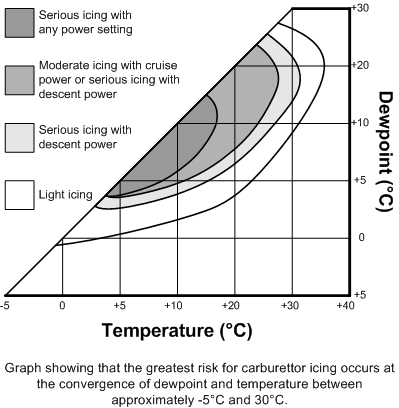 Carburettor icing is one of the most frequent causes of unexpected engine failure during flight. An encounter with carburettor icing is most likely when in moist air conditions and between temperatures of -5 and 30°C.; a temperature of 15°C. presents the highest risk, but the Relative Humidity must be at least 50%.