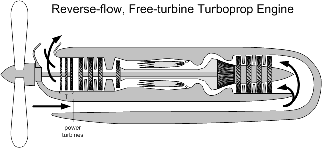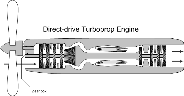 There are two types of turboprop engine, the first is referred to as a direct-drive turboprop, and the second is a free-turbine turboprop. With the direct-drive system, the propeller is connected to a shaft and turbine and the speed of the propeller is modified through a reduction gear mechanism; in the free-turbine system, the propeller is connected to what is referred to as a power turbine which “floats” in the high pressure exhaust gases in the turbine section.