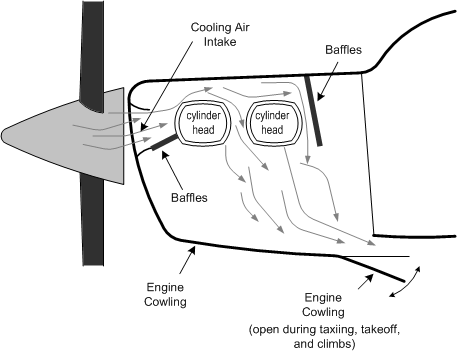 With higher performance aircraft that are more tightly cowled, the quantity of air moving through the baffles can be controlled by the pilot via cowl flaps, which are like reverse air scoops; the cowl flaps are opened during taxiing or during climbs to increase the volume of air movement, and are closed to reduce drag during the cruise phase.