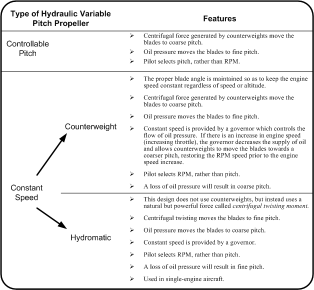 The table below summarizes the three types of hydraulic variable pitch propellers.