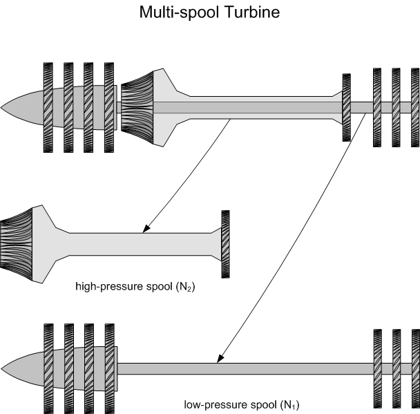 In contrast, the term multispool engine refers to turbine engines where there is more than one shaft running though the core, each shaft having it own independent set of compressors and turbines that turn at different speeds. The term spool denotes the compressor, the turbine, and the shaft that connects the two. Where two shafts exist—known as dual-compressor engines—the first compressor (most forward in the engine) is referred to as the low-pressure compressor, and it is driven by the most reward turbine. The speed at which this compressor turns is known as N1. The second compressor in the dual-compressor engine is referred to as the high-pressure compressor; it is connected to the high-pressure turbine, and the speed of its rotation is N2.