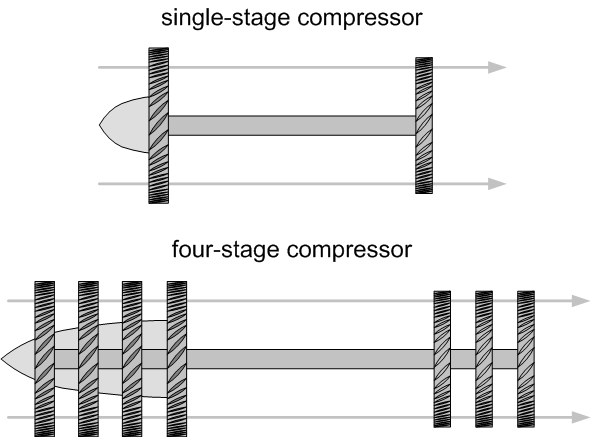 A turbine typically has a series of compressor wheels mounted on a single shaft, and each wheel or fan is referred to as a stage (a “stage” includes the compressor wheel and the fixed stator vanes which position the flow for the subsequent compressor wheel). Each stage increases the compression of the airflow—what is referred to as a multistage compressor.