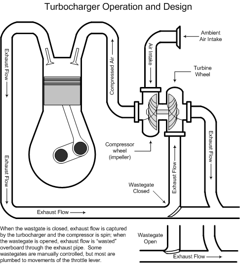 Superchargers are compressors driven by the engine and are mounted between the carburettor (or fuel control unit) and intake manifold. Turbochargers are compressors driven by an exhaust turbine and mounted between air intake and the carburettor (or fuel control unit). The effectiveness of a turbocharger system is regulated by a wastegate. When the wastegate is open, exhaust gas is vented pasted the turbine wheel into the atmosphere; when the wastegate is closed, the exhaust gas is forced into the turbine to provide turbocharging.