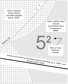 Note carefully the Legend that appears on LE charts. On the bottom right-hand corner of the Legend—under Miscellaneous—we are told that all green-shaded areas of the Chart indicate uncontrolled airspace below 18000’ ASL, while the white areas indicate controlled airspace below this altitude, including Low Level Airways, and Transition Areas. The Chart further delineates areas where controlled airspace exists above 12500’ ASL (Low Level Airways and Control Area Extensions)—all green areas patterned with white square (with green shade) hatching. Finally, note under this section is the description of isogonic lines (darker green and dashed). Note also the Area Minimum Altitudes (AMAs), which provides 2000’ clearance over the obstacle within the quadrantal (established by degrees longitude and latitude).