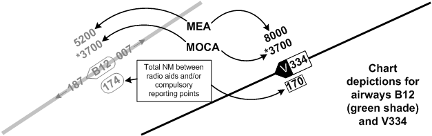 Perhaps the most important information on the LE for the IFR pilot is the MOCA (Minimum Obstruction Clearance Altitudes), which is marked with an asterisk, and MEA (Minimum En Route Altitudes), which lack an asterisk (see below).