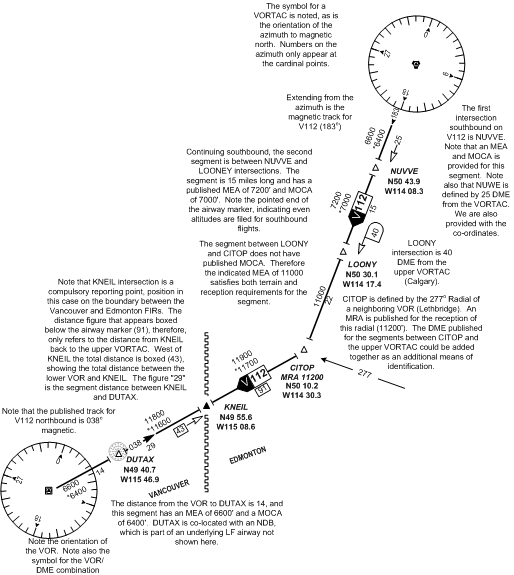 The radio aid, distance and course data for the airway V112 between Calgary VORTAC and Cranbrook VOR is examined in detail to below. Note that the actual distances between symbols are only approximated for the sake of clarity.
