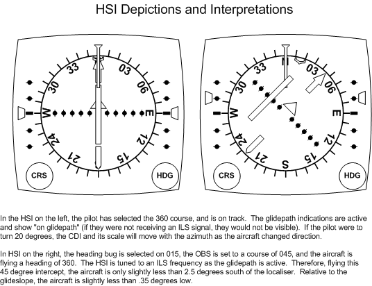 The Localizer is unidirectional in that only the approach end of the runway—referred to as the front course—has conventional CDI display and interpretation—e.g., left CDI deflection means “fly left” for on course. If you were to make an approach on to the opposite runway, and centreline signal is still transmitted via the Localizer, but the CDI is not “reverse read;” accordingly, a pilot making an approach on this opposite or reciprocal runway with a left CDI indication would have to “fly right” for the “on course.” This reverse-read side of the runway is referred to as the back course. If an aircraft is equipped with an HSI or Horizontal Situation Indicator (see below), which is essentially a CDI display superimposed on the Heading Indicator, the CDI display will not reverse read on the back course (as the pilot essentially sees the CDI upside-down).