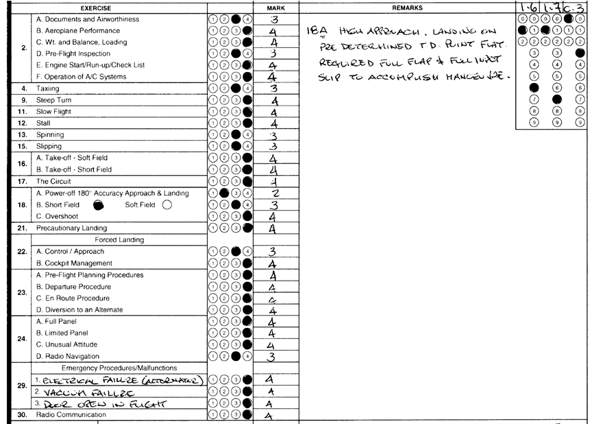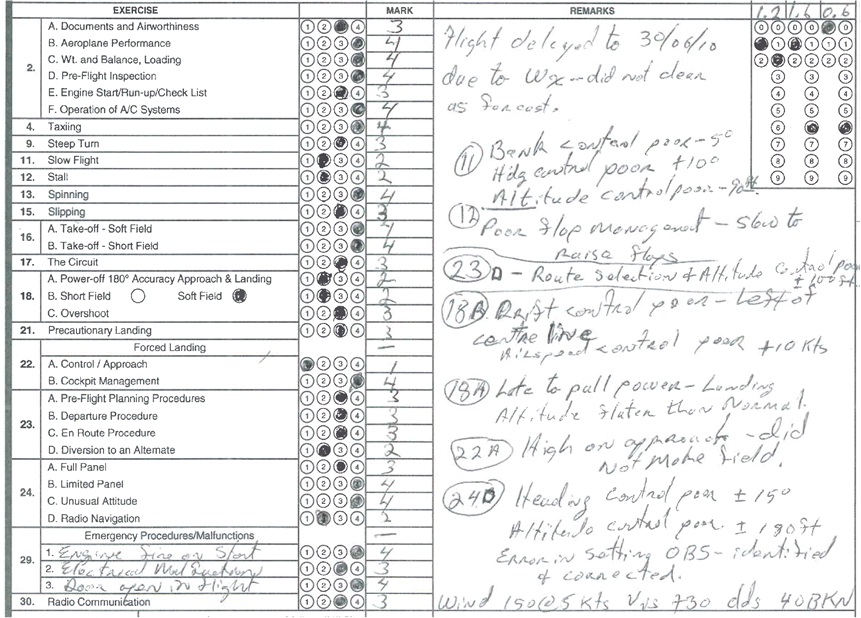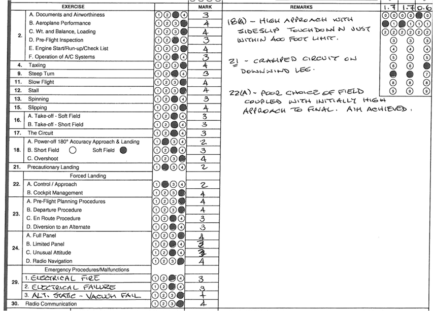 The collection of Flight Test Report samples below are derived from actual flight test results, so you will be reading raw Pilot Examiner notes. The idea, of course, is for you to read the comments of the examiner with the idea that you will know not to display in your own flight test. Unfortunately, the examiner comments are abridged and do not shed a lot of light on what occurred, but there should be enough information for you to get a sense of their general thinking leading to the mark-down. Remember that comments are only provided for scores of 2 or lower (i.e., 1). Therefore, when a candidate does well on an exercise, there will not be any more information other than the score of 3 or 4.