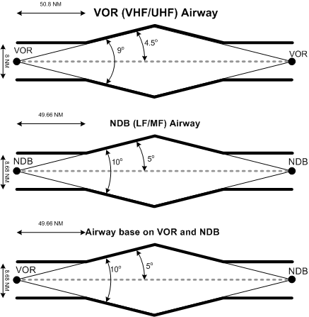 Airways between NDBs have the same base and ceiling, but their minimum width is 4.34 NM either side of the beacon, and splay by 5° from the centre line. After a distance of 49.66 NM from a NDB, the splay begins to increase the width of the airway.