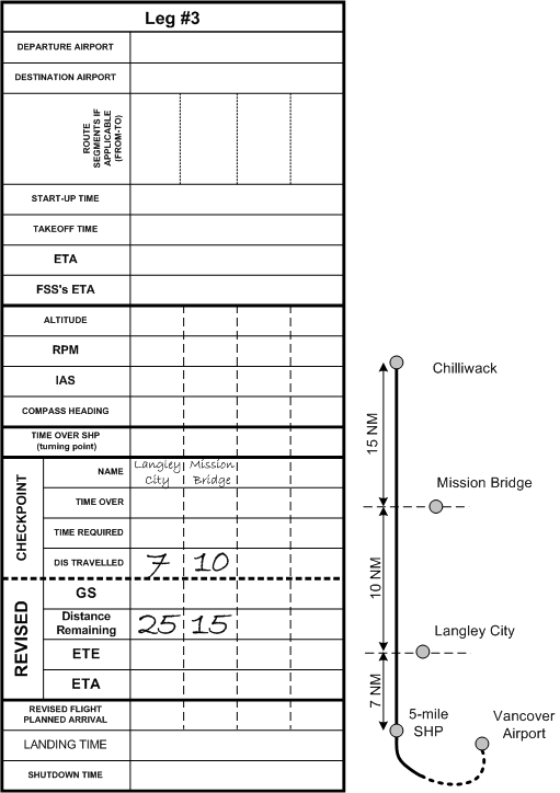 When filling in the navigation data, extra caution must be given to the units used for recording distances. Never get confused as a result of mixing nautical miles with statute miles. The simple rule is to convert all distances to nautical miles—i.e., any distances associated with navigation should be NM, and not SM.10 Generally, the use of statute miles during flight—such as the Cherokee, for example—is limited to aircraft performance speeds, and are not generally used for navigation.