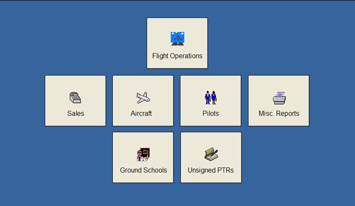 The screen image below shows the program features as viewed by a supervising flight instructor, provide access to all operational features. Students only access the Flight Operations feature, which is used for the dispatch and authorization of training flights, the Aircraftfeature, which is used for the technical dispatch of aircraft, and Pilots, which hourses the student's personal training records.