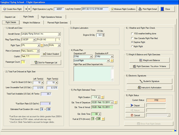 The screen image below displays what is completed by student prior to a training flight. The fuel quantity and oil qantity is completed by the student, and the authorization feature that incorporates electronic signing by crew is displayed on the right.