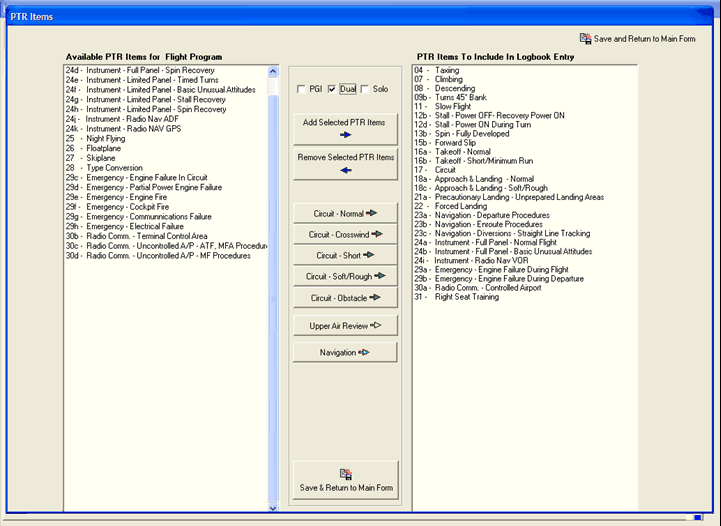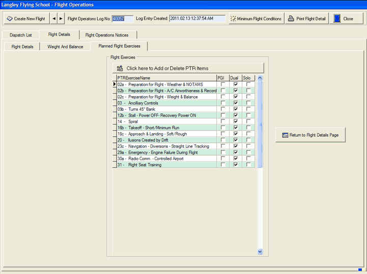 The screen below shows the intended flight exercises for the flight, in this case, dual instruction with a flight instructor. "PGI" indicates when Preparatory Ground Instruction has been provided (necessary for all new exercises), and "Solo" would be indicated if the student pilot was practicing on their own.