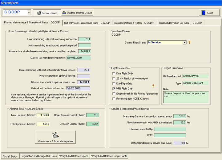 The screen image below provides students and staff with a summary of airworthiness or technical dispatch status of an aircraft prior to is use for a training flight. This main screen summarises the in-phase maintenance cycle and operational status for the aircraft, while the tabs along the top provide access to similar screens that pertain to out-of-phase maintenance tasks and the deferred defect status of aircraft equipment and systems.