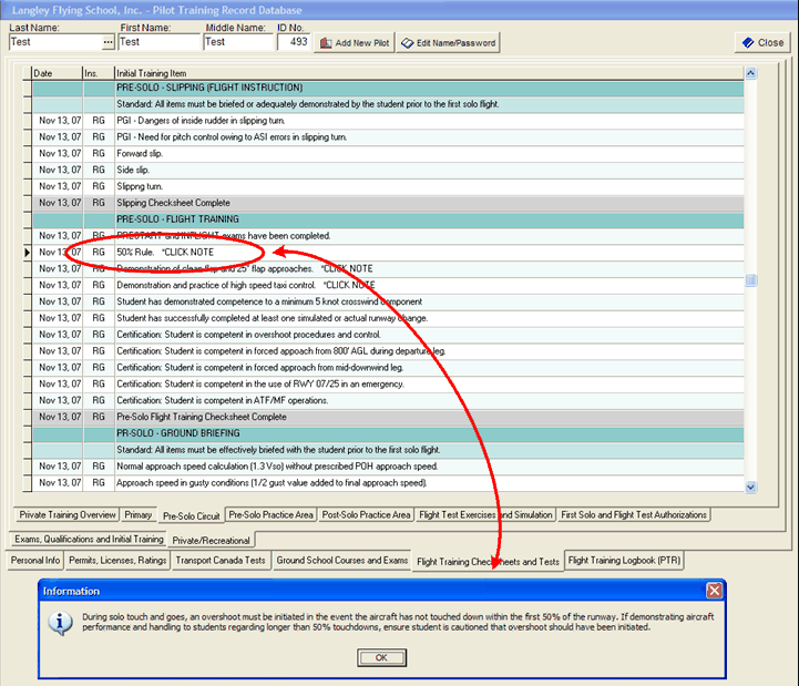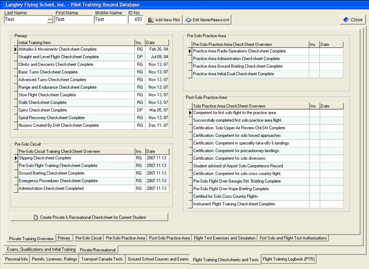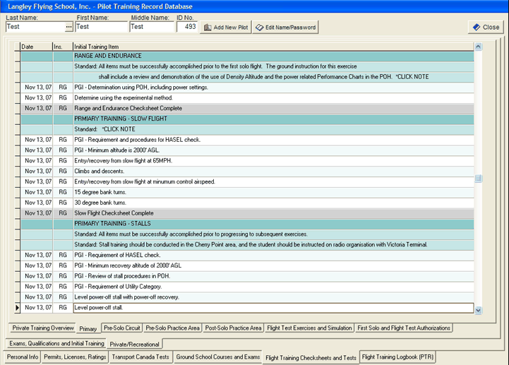 The screen below shows the central instructor check-sheet tracking summary, which essentially summarizes the curriculum students pass through on their way to becoming a Private Pilot. The progress of students follows the basis phases of training, including Intial Training (basic, intermediate, and advance maneuvers), Pre-solo Circuit Training (takeoffs and landings), Pre-solo Practice Area Training (preparing the student for solo flights from the airport to the practice area just north east of Langley Airport) Post-solo Practice Area Training (which consists of navigation training, instrument training, and flight test preparation training).
